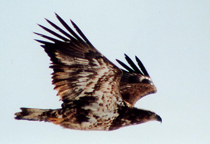 AN IMMATURE BALD EAGLE IS SOMETIMES MISTAKEN FOR A GOLDEN EAGLE.