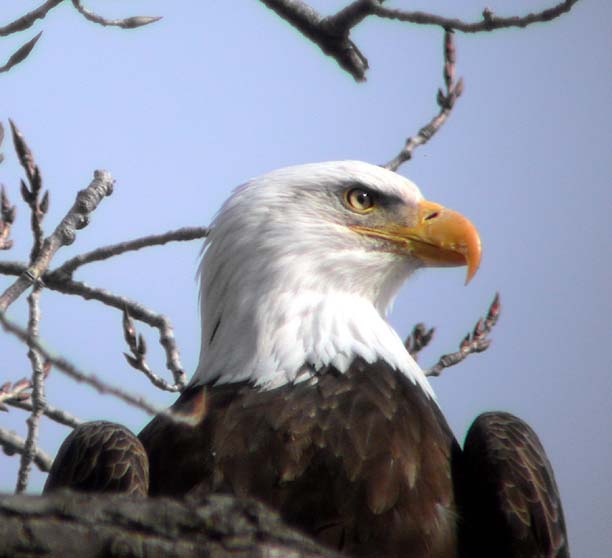 A BALD EAGLE PERCHED HIGH ATOP A TREE OVERLOOKING PIASA HARBOR BETWEEN ALTON AND ELSAH, ILLINOIS