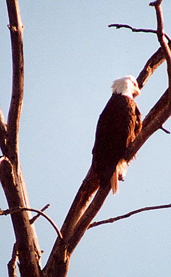 A BALD EAGLE OVERLOOKS THE ILLINOIS RIVER IN ILLINOIS BETWEEN GRAFTON AND PERE MARQUETTE STATE PARK
